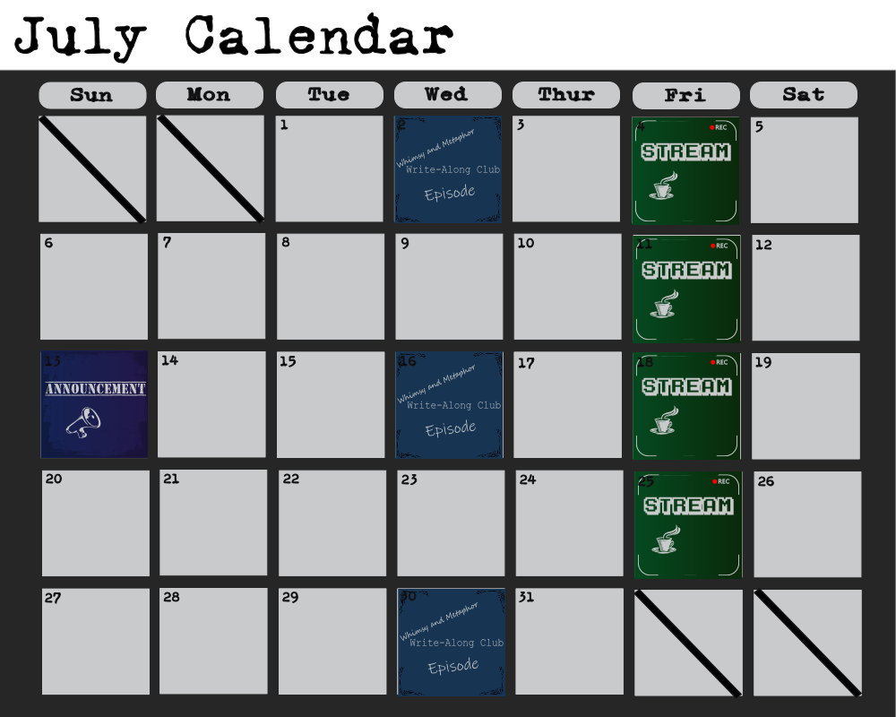 Whimsy and Metaphor Write-Along Club (if this is news to you, here’s my announcement post on it) happens on YouTube and releases at 5pm every second Wednesday. Stream announcements happen during episodes, and also on Bluesky – there is one upcoming, but it won’t be til next month – probably on Sat 3rd August, but I’ll update with specifics as they arrive.